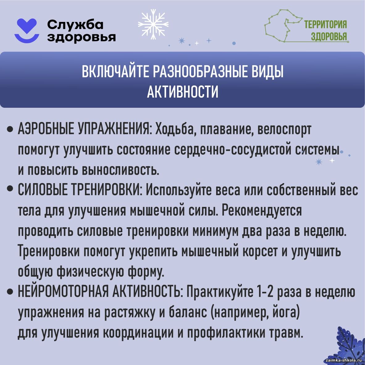 В рамках нацпроекта «Продолжительнаивя и актная жизнь» каждую неделю готовятся тематические дайджесты, посвящённые вопросам здоровья и долголетия россиян. Дайджест недели Тема текущей недели: Активный образ жизни Мы рассмотрим преимущества физической активности, поделимся полезными упражнениями и дадим рекомендации, как сделать физическую активность частью повседневной жизни. Следите за обновлениями, чтобы оставаться здоровыми и энергичными вместе с нами!