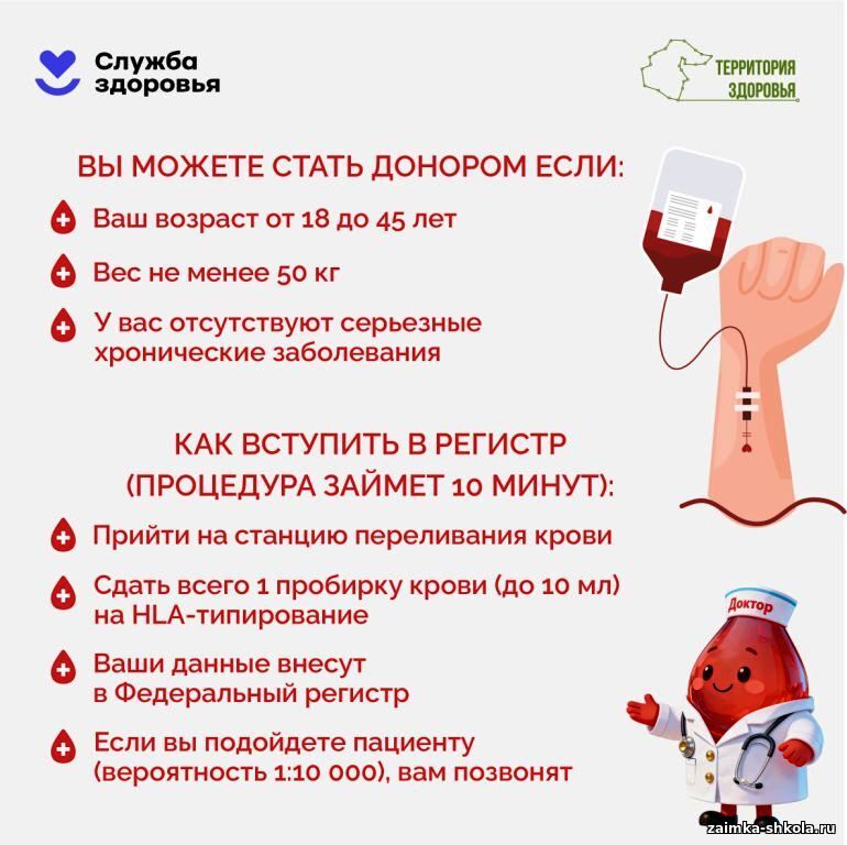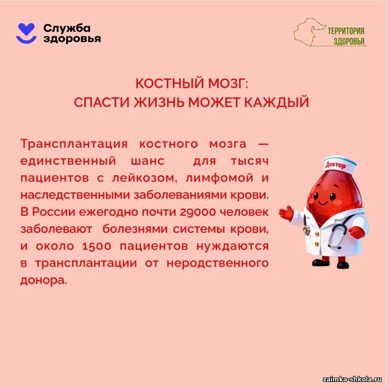 Костный мозг — это шанс на жизнь. Для многих пациентов с лейкозом пересадка костного мозга остается единственным методом лечения. Стать донором может практически любой здоровый человек от 18 до 45 лет. Для этого не нужна операция — в 90% случаев клетки забирают из вены, как при обычном донации крови.